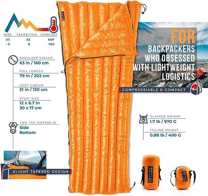 - ✅ LIKE HAVING A QUILT IN THE BACKCOUNTRY - Soft fabrics and lofty down insulation make it feel like sleeping under your comforter back at home, so you can get a good night's rest whether you're camping in the backcountry or traveling the country in a van. This might be your best night's rest under the stars. Degree range: 23 ~ 32 ~50F