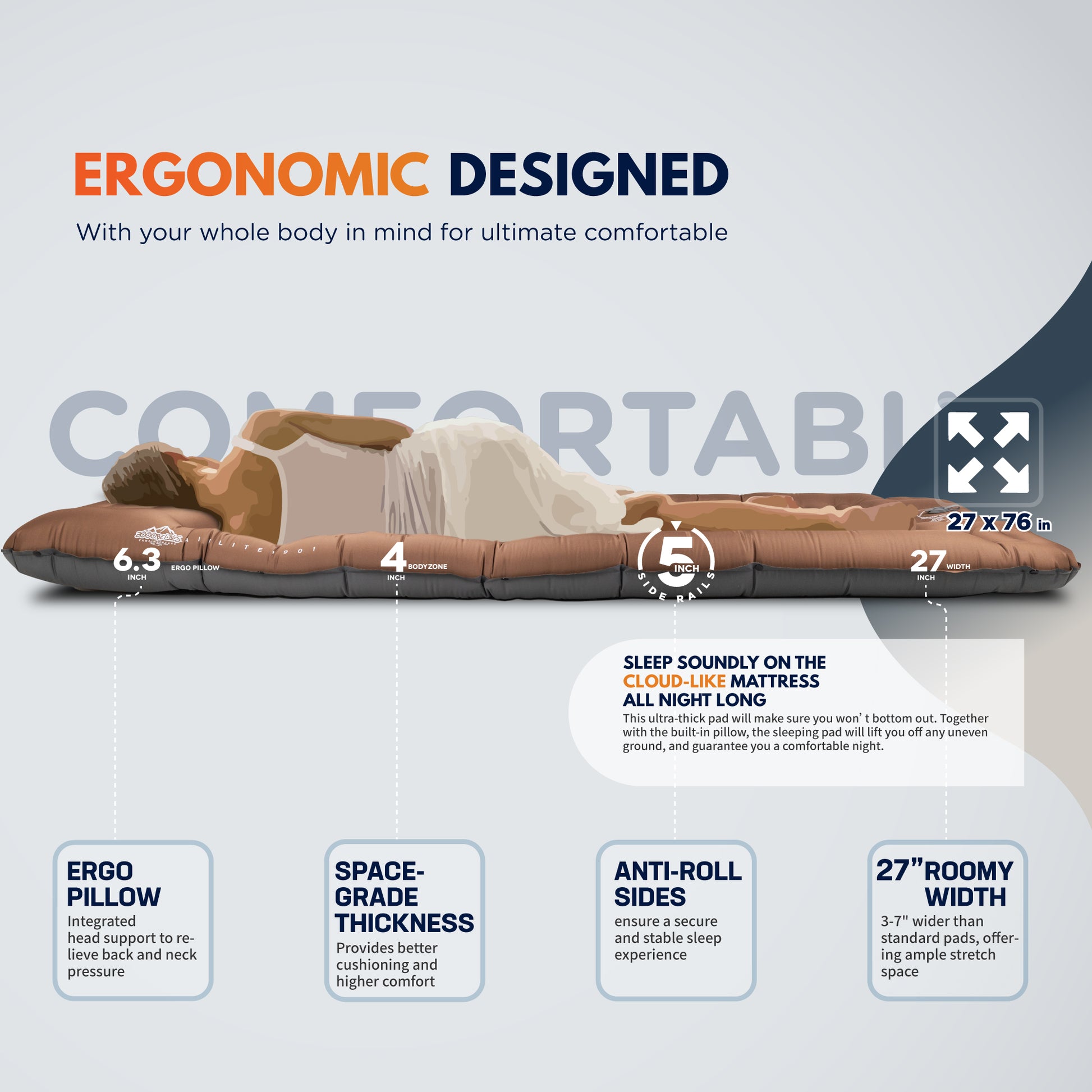 Special Feature: 4" thick body zone protects from rough, hard and cold, The snap buttons allow you to connect pads together, Ergonomic Designed 6.3" pillow and 5" edge plush for ease neck & back strain, Wider than standard, eliminates crampedness, Fast inflation/deflation with built-in foot pump