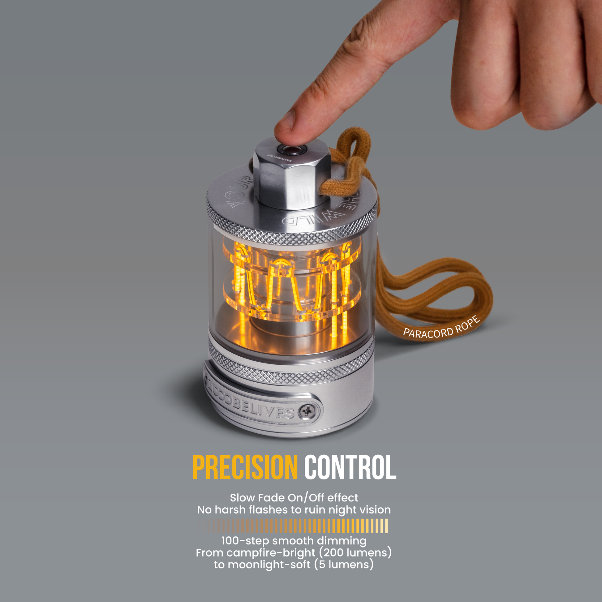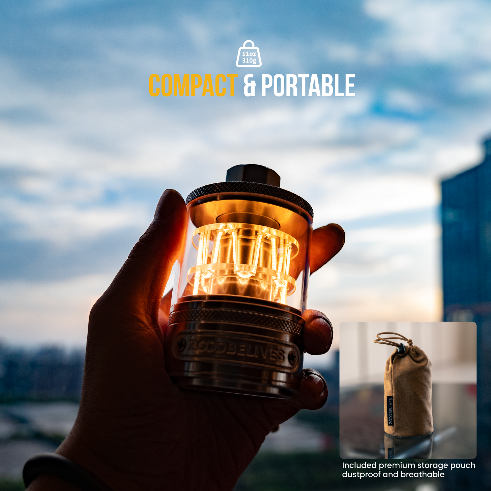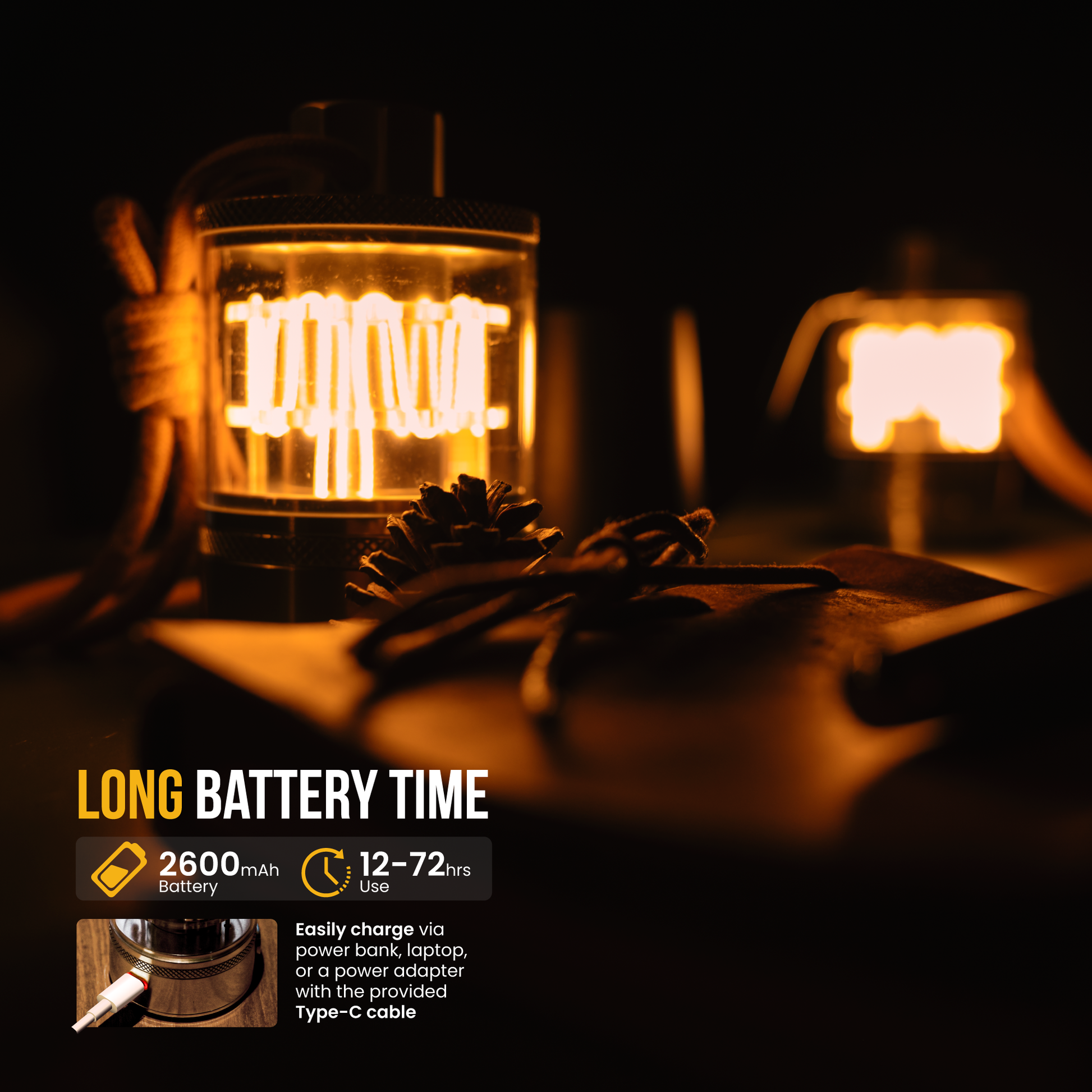 - 【BUILT FOR THE LONG JOURNEY】- This Φ 2.36" x H 3.94", 11 oz aluminum lantern combines precision engineering with intuitive function: smooth dimming controls (3-second fade), 72-hour max runtime (2600mAh via USB-C), and IPX4 splash resistance. The perfect balance of trail-ready durability and home-friendly ambiance—whether illuminating backcountry campsites or weathering urban power outages
